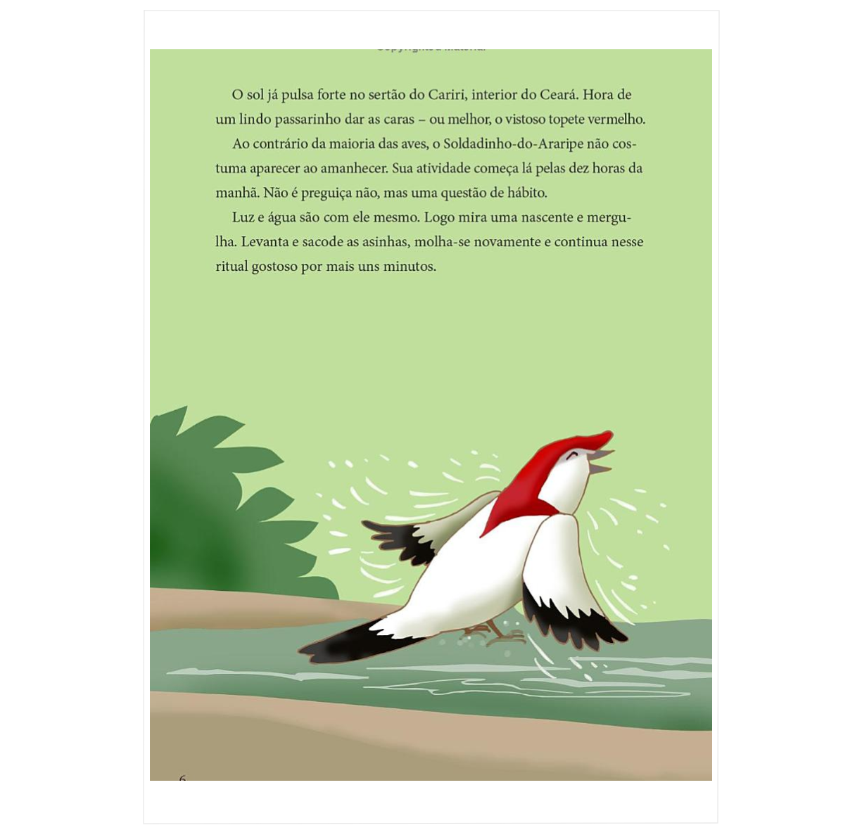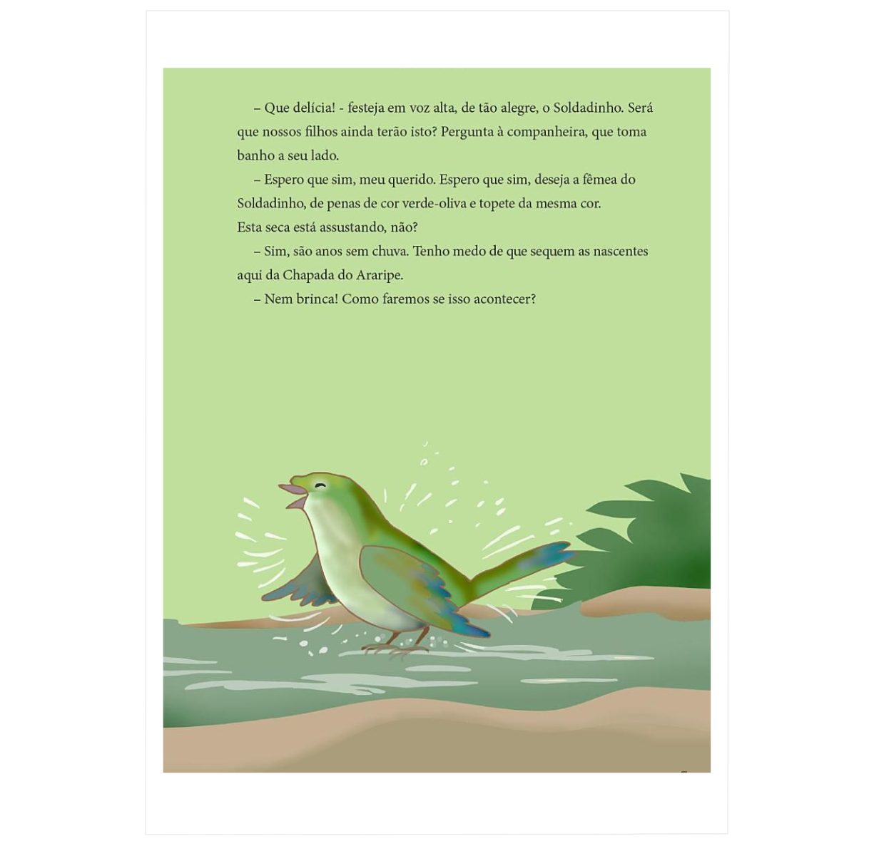 Em companhia de Piu-Piu, um novo amigo, eles decidem viajar. No caminho, visitam a Serra da Capivara, conhecem as pinturas rupestres, fazem novas amizades e até ajudam a resgatar um simpático jegue abandonado. O livro, escrito pela jornalista e observadora de aves Cristina Rappa e ricamente ilustrado por Maurício Veneza, foi inspirado em três viagens da autora a essa região especial do nordeste do Brasil. Um convite para acompanhar o Soldadinho nesta linda jornada.