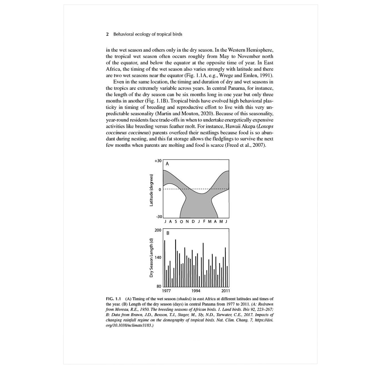 Escrito por especialistas internacionais no comportamento de aves tropicais, o livro explora por que os trópicos são um laboratório natural único para estudar a evolução do comportamento das aves e por que as espécies de zonas temperadas são tão diferentes. Um aumento recente nos estudos sobre aves tropicais ajudou a reduzir o viés em direção às zonas temperadas, originado pelo fato de que a maioria dos modelos de espécies em ecologia comportamental estava adaptada aos climas temperados do hemisfério norte.