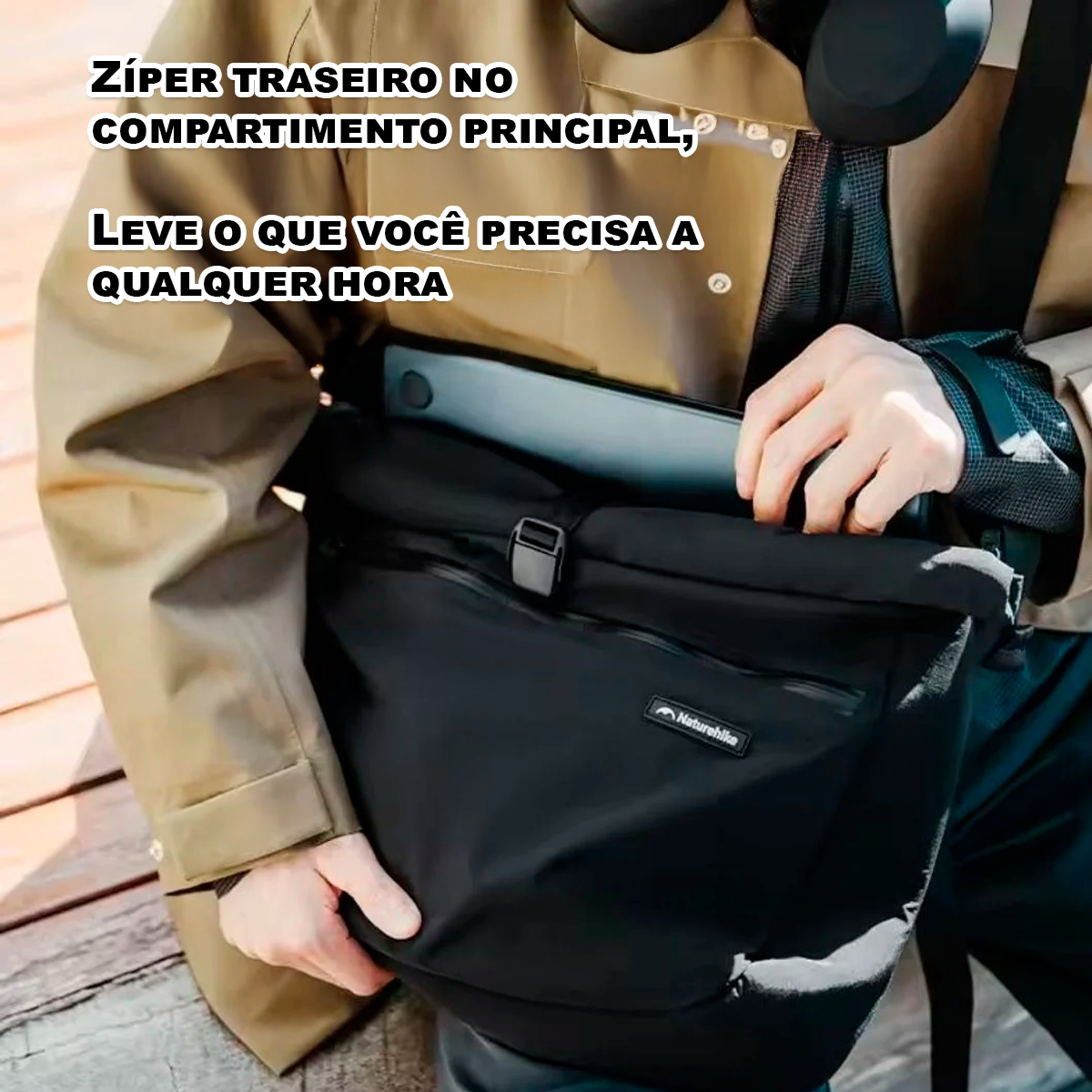 A Bolsa Transversal Naturehike Oxygen combina estilo urbano com funcionalidade outdoor. Com sua capacidade de 15L e sistema de tampa enrolável, adapta-se a três volumes (36.5x34x9cm/26x34x9cm), perfeita para carregar o essencial. Fabricada em fibra de poliamida 100% resistente à água, inclui um compartimento acolchoado para laptops de até 13" e bolso deslizante para organizar pequenos objetos.