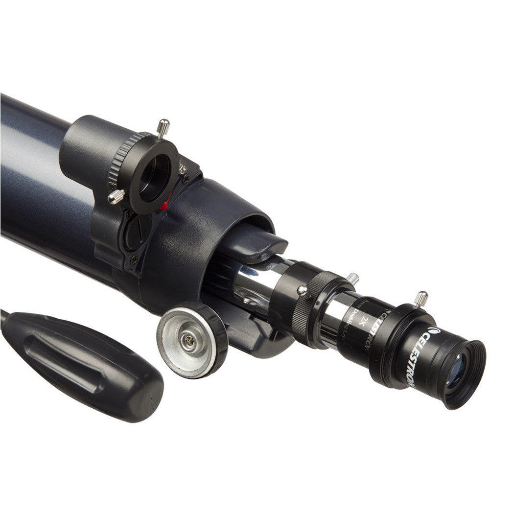 Oculares: As oculares de 15 mm e 6 mm podem ser utilizadas em qualquer telescópio com um focador de 1,25". Cada ocular está totalmente revestida para melhorar a transmissão de luz e proteger a ótica. A ocular Kellner de 15 mm oferece uma boa visão de ampliação média na maioria dos telescópios, e a Plossl de 6 mm proporciona grandes ampliações, excelente para a Lua e os planetas, especialmente quando as condições de observação são boas.